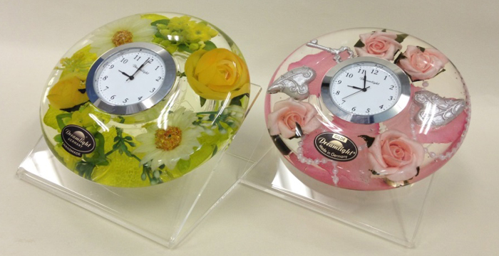 マウスブロウで成形した薄く透明なガラスの中で、艶やかに咲くアーティフィシャルフラワーやキラキラ輝く装飾品のアレンジメントをお楽しみいただけるドイツ製ドリームライトシリーズのインテリア置時計です。
