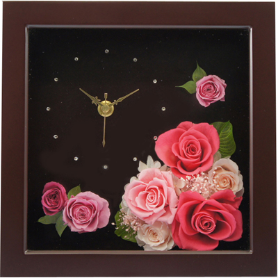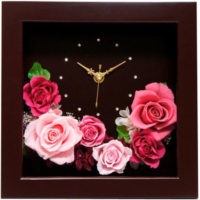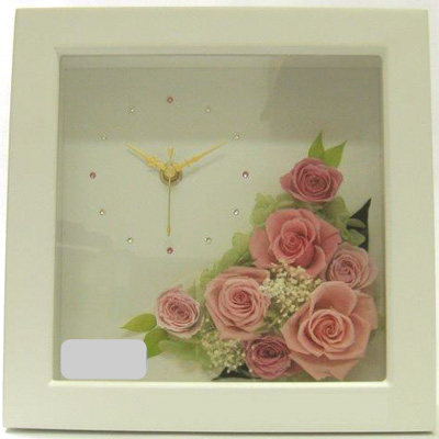 可愛いプリザーブドフラワーのバラのアレンジメントと時計のコンビネーションです。華やかなプリザーブドフラワーの時計はご結婚のお祝いやご結婚記念日、そして披露宴でのご両親へのプレゼントなどにとても人気があります。オリジナルの名入れメッセージを彫刻してお届けします。 |